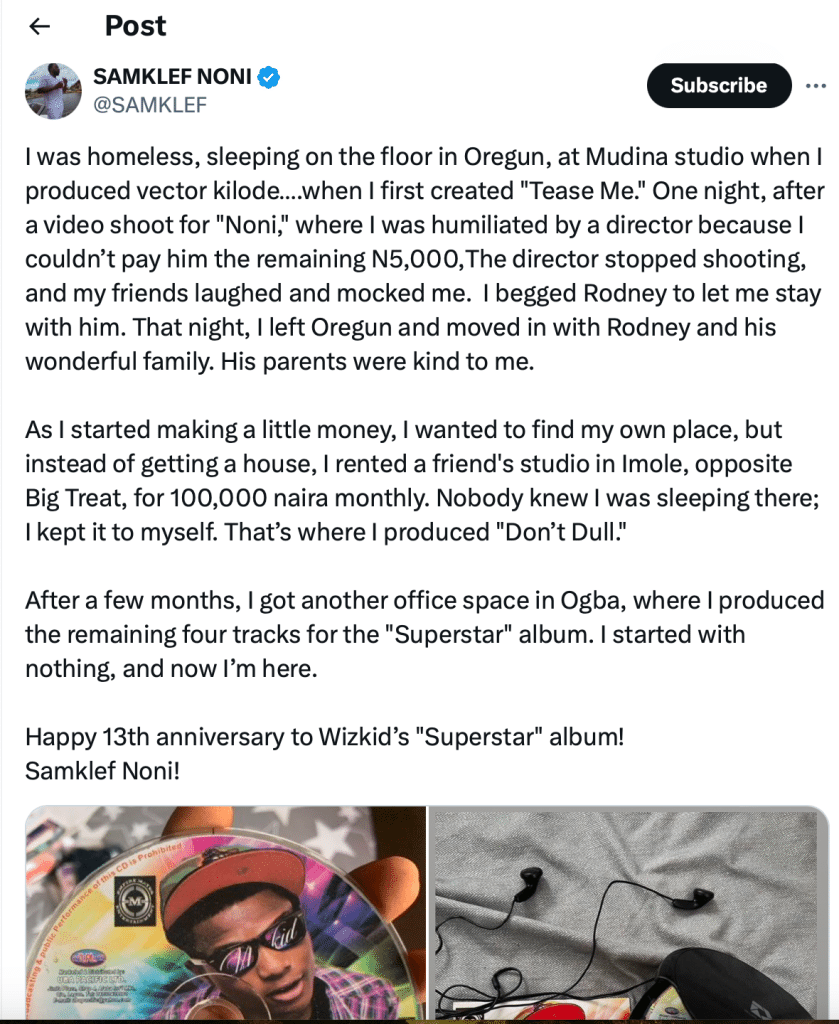 Samklef has taken to his page to reflect as he shares how he used to be homeless and slept on the ground while working as a struggling producer.